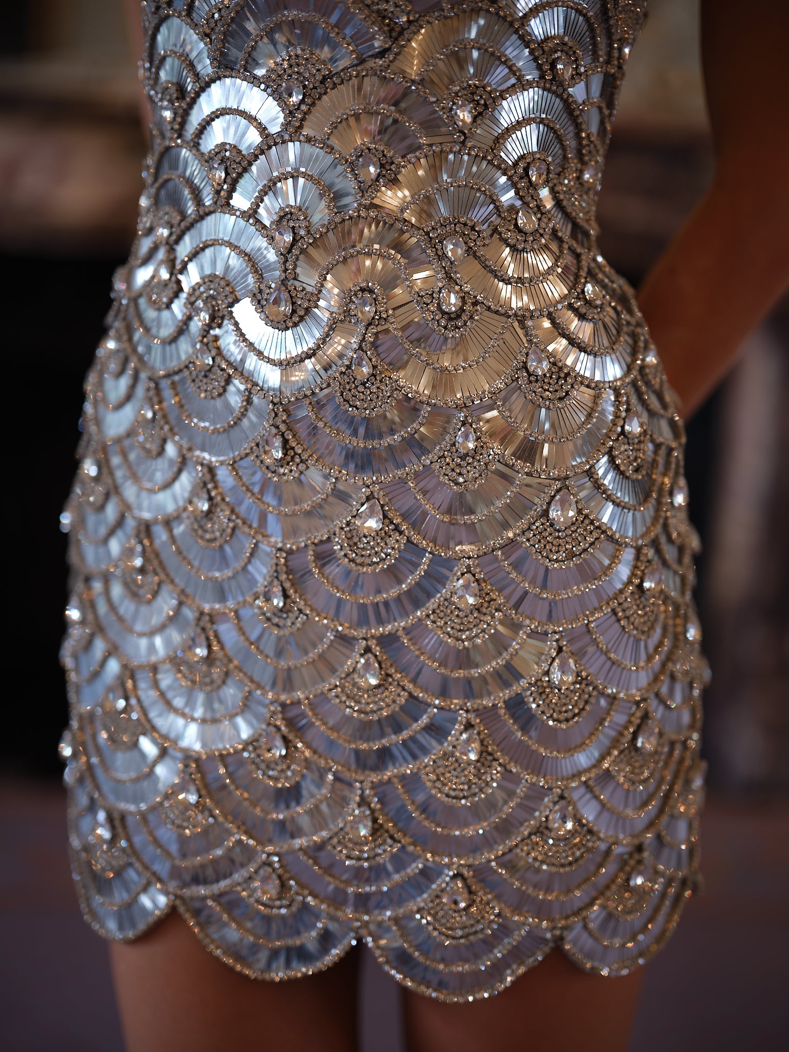 Each Adara is crafted by skilled artisans, requiring over 130 hours of handwork. The fan-shaped scallop design is built piece by piece, with every curve carefully constructed and adorned with rhinestones to create a fluid, mosaic-like surface of brilliance. The strapless silhouette highlights the form, while the reflective, scalloped layers catch the light with every movement, imitating waves of liquid silver.