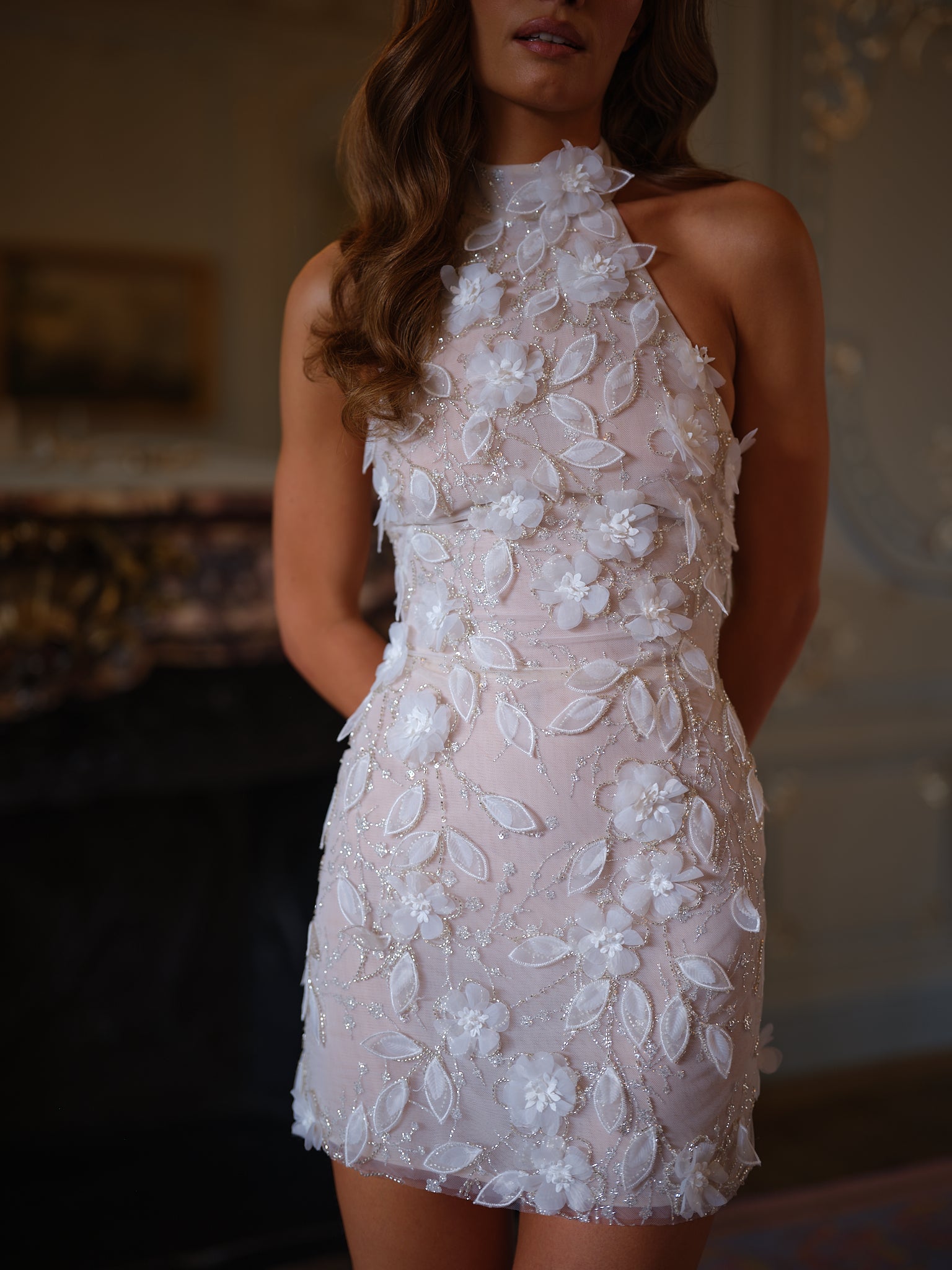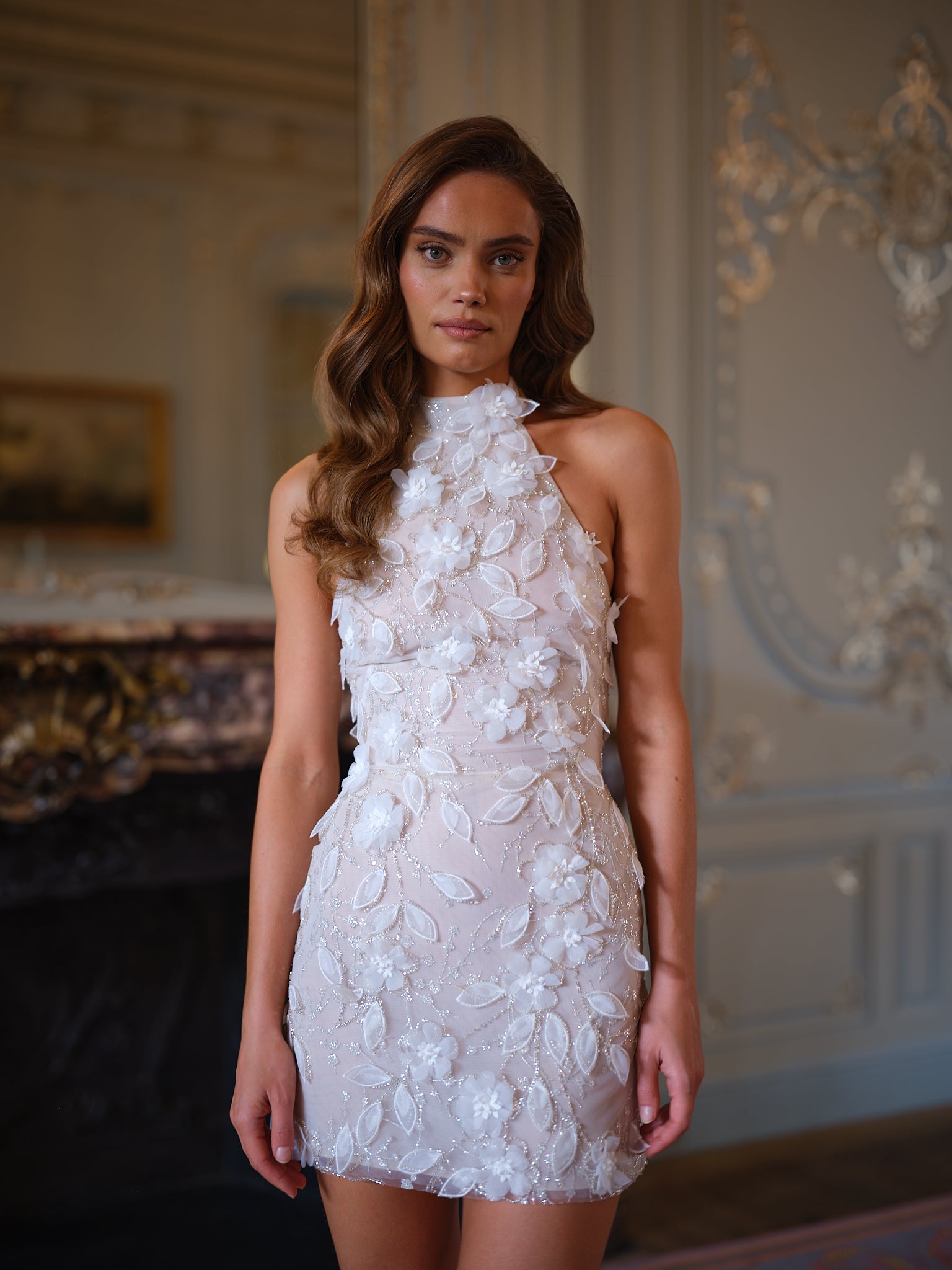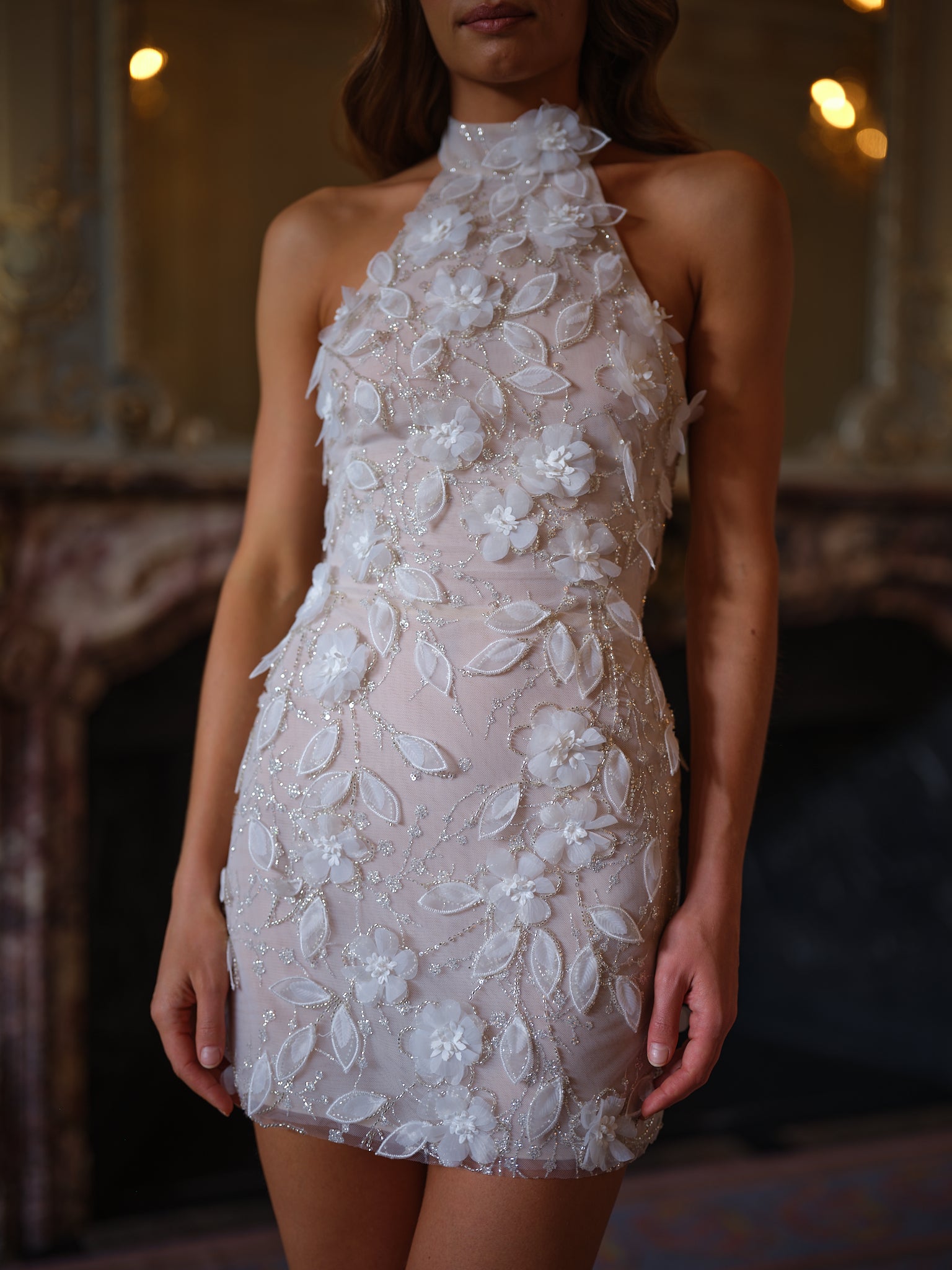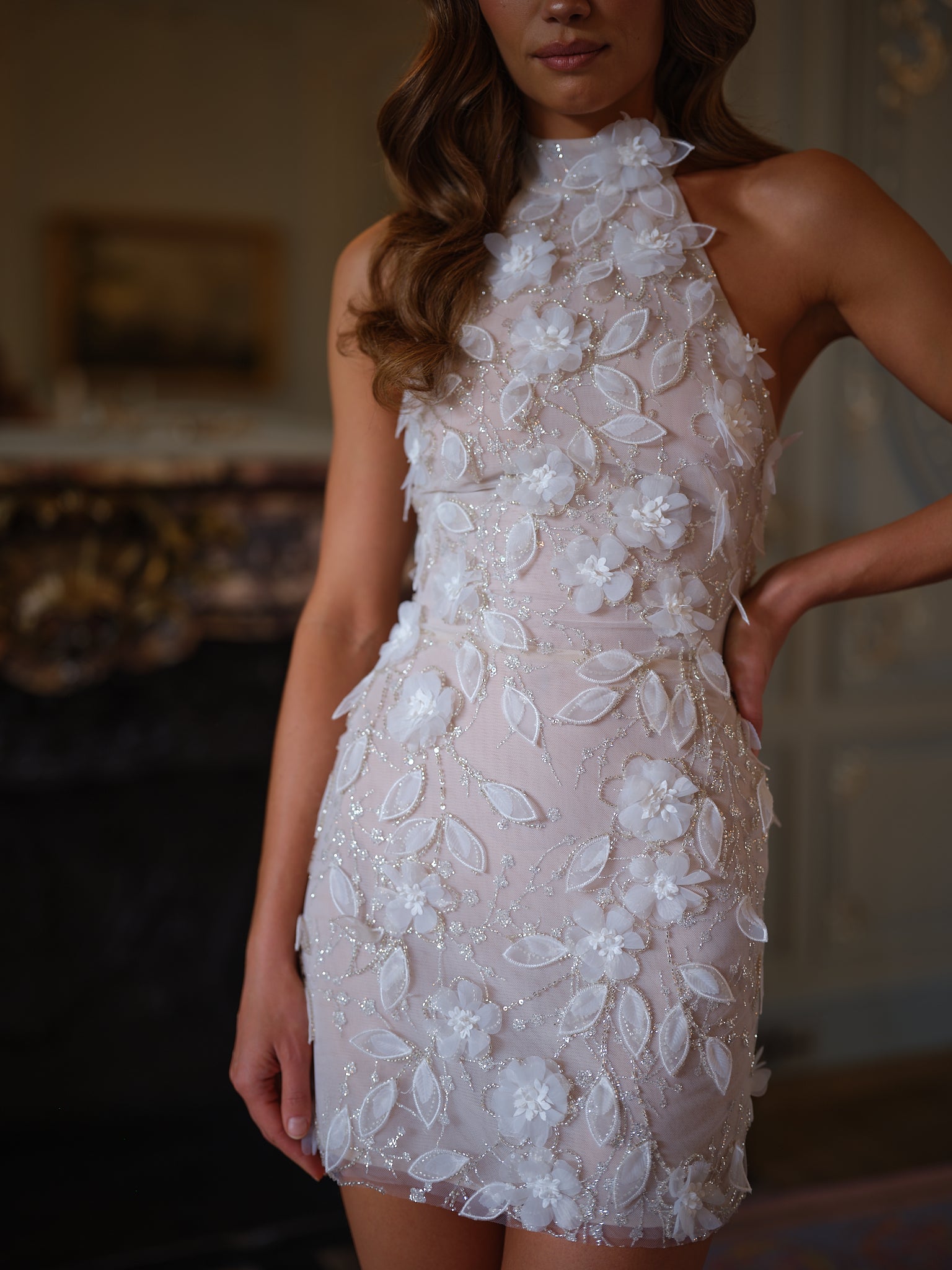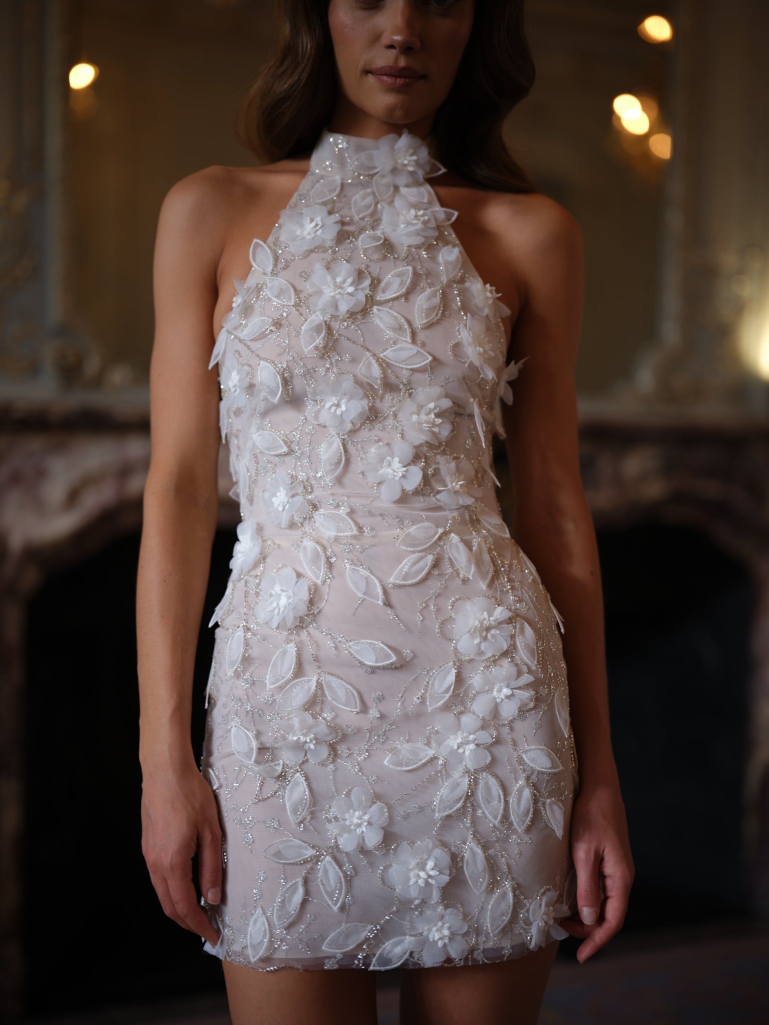 This high-neck halter mini is crafted from sheer tulle, richly adorned with 3D floral appliqués and shimmering beadwork that trace every curve with delicate luminosity. Each petal is hand-placed, creating a garden-like effect that feels organic yet sculpted. The fitted mini shape keeps the look sleek and modern, while the embellished textures add dimension and couture flair.